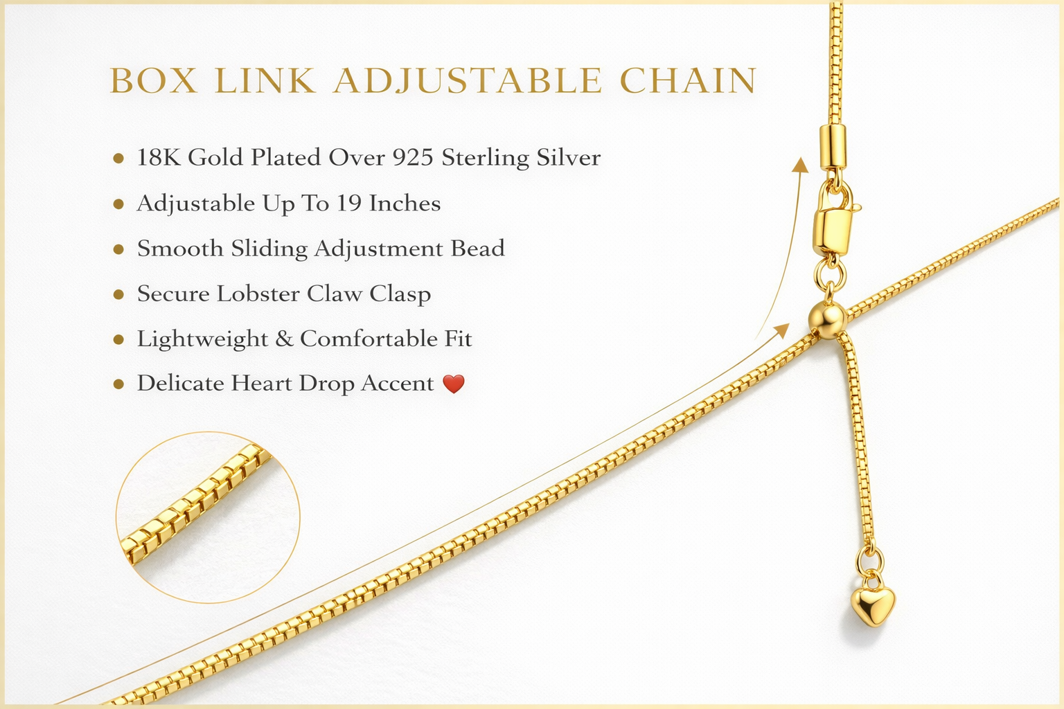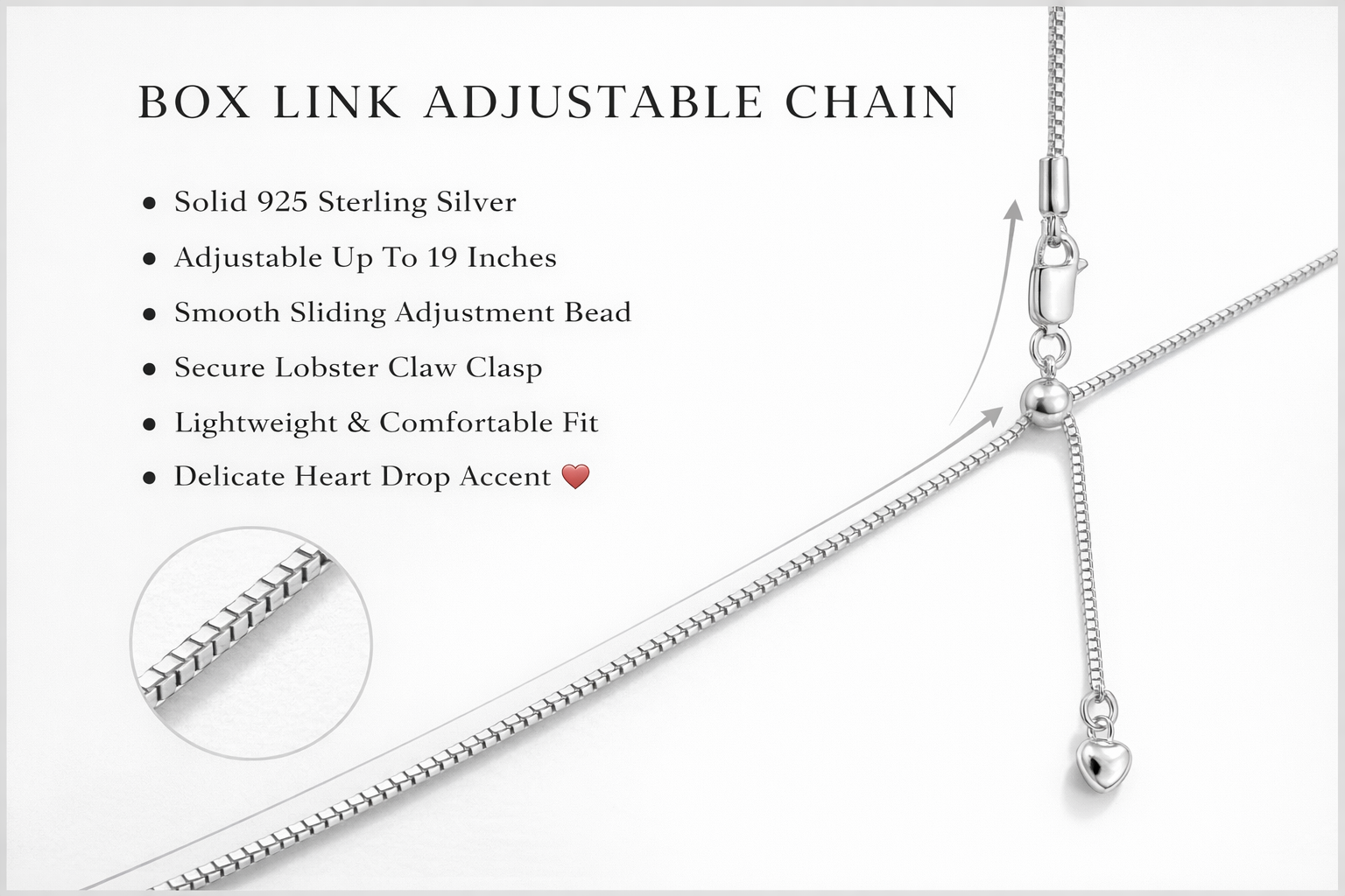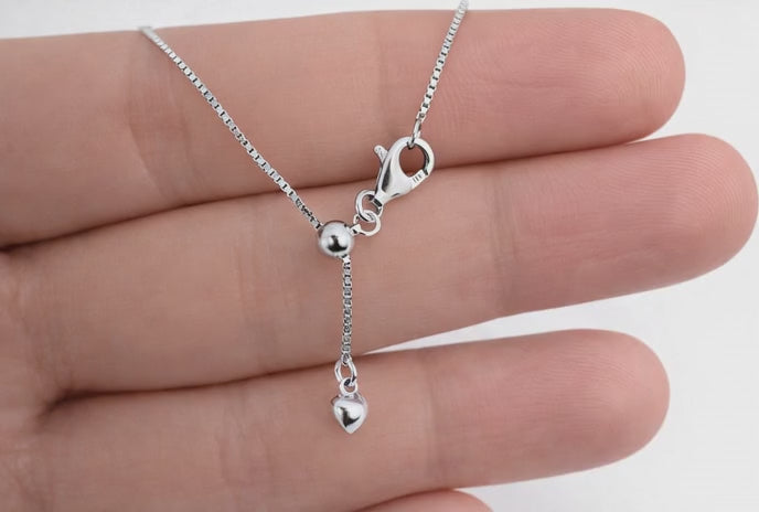 Elevate your jewellery collection with our 925 Sterling Silver Adjustable Box Chain Necklace. Featuring a clever sliding bead adjuster, this elegant 19-inch chain can be worn at your preferred length — from a delicate choker to a graceful décolleté drape. A sweet heart charm adds a romantic finish whether worn alone or paired with your favourite pendant.
