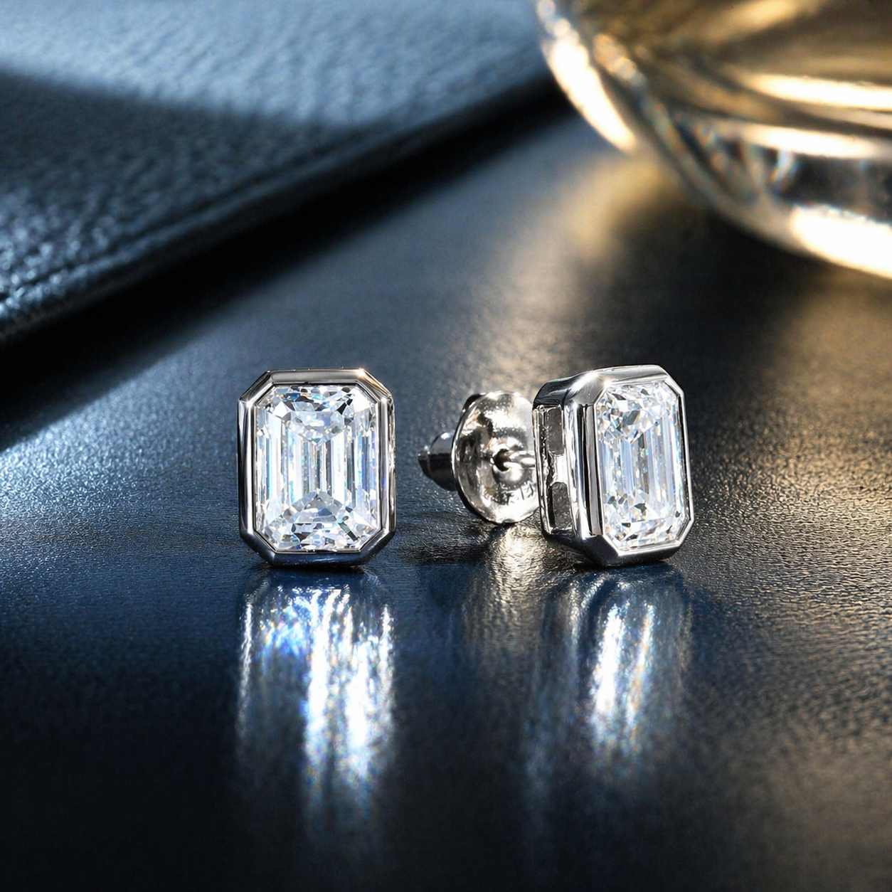 Bezel Emerald Cut Moissanite Stud Earrings | 925 Sterling Silver | 2 CTW D Color VVS1