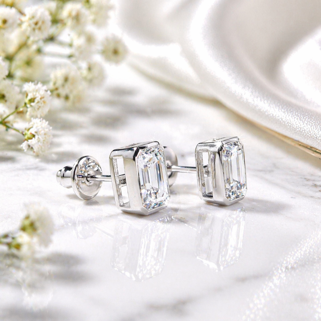 The Bezel Emerald Cut Moissanite Stud Earrings from Adora Fine Jewelry deliver the distinctive hall-of-mirrors brilliance of the emerald step cut in a sleek, protective full bezel setting. Crafted over genuine 925 sterling silver in your choice of rhodium or 18K gold plating, these earrings offer certified D Colorless, VVS1 moissanite quality at an accessible everyday price.