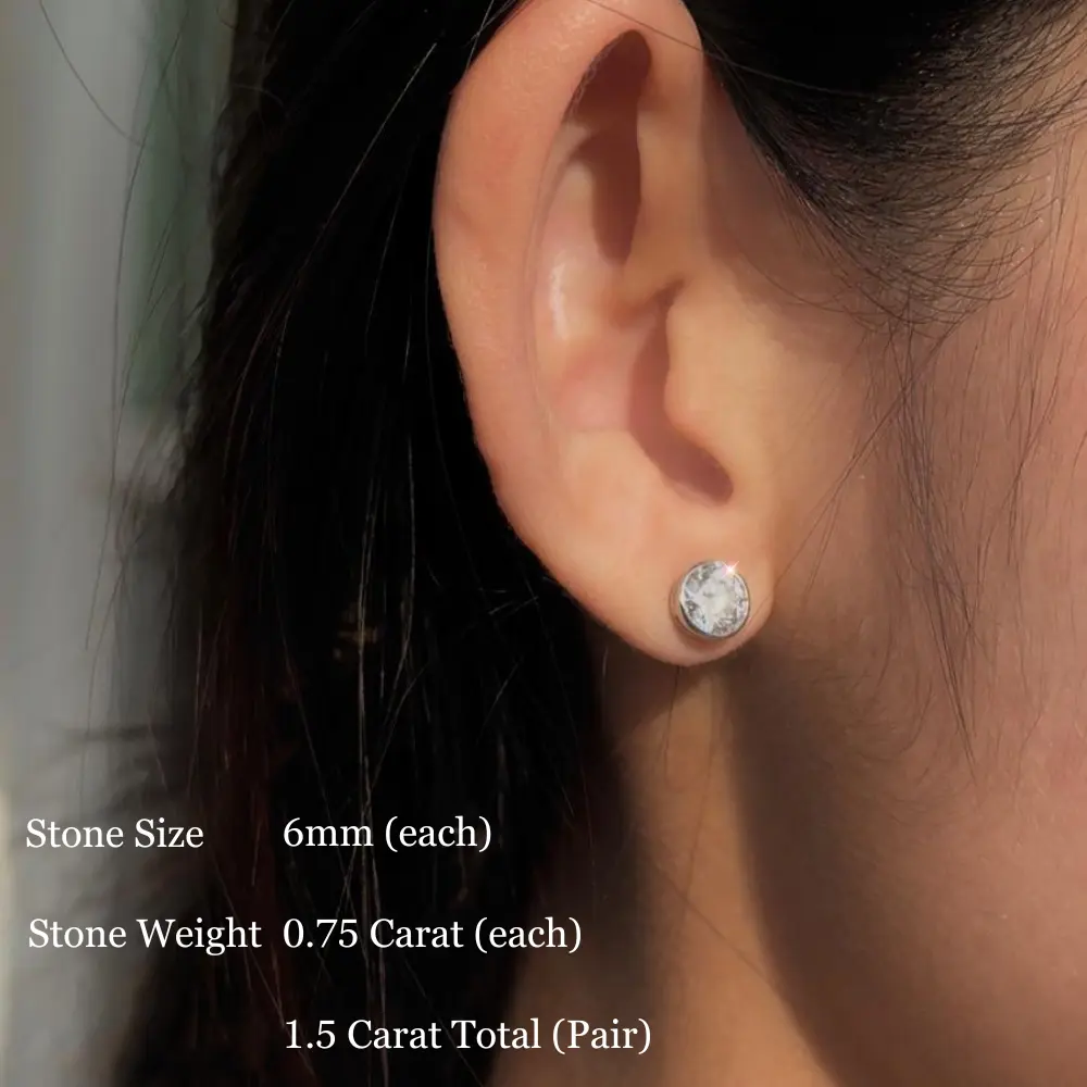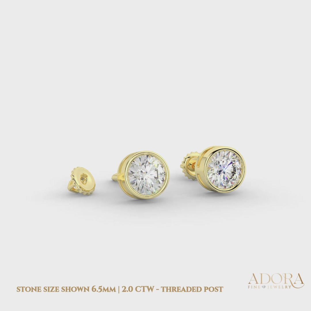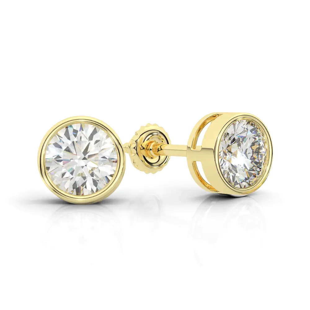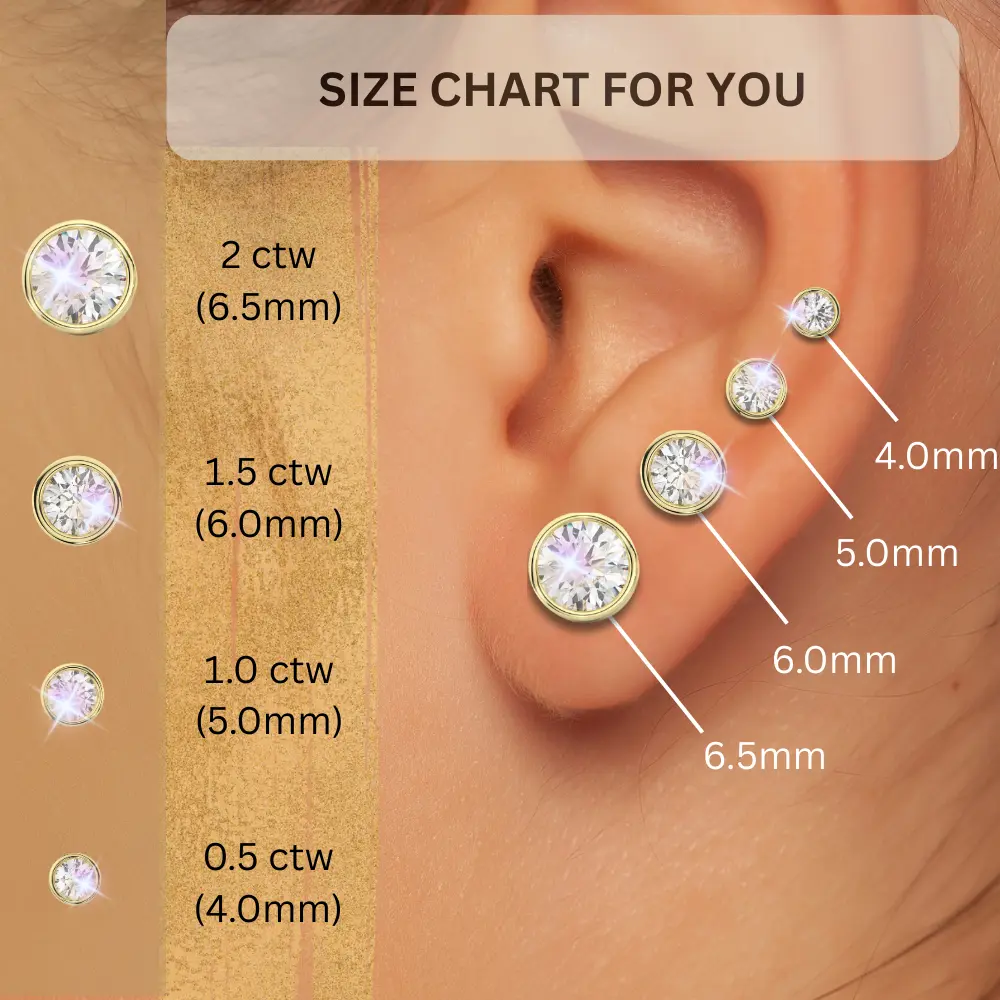 14K Solid Gold Moissanite Bezel Stud Earrings | Round Cut | 0.5 to 2 CTW | VVS1 D-F Color | Push Back or Screw Back | Made in USA